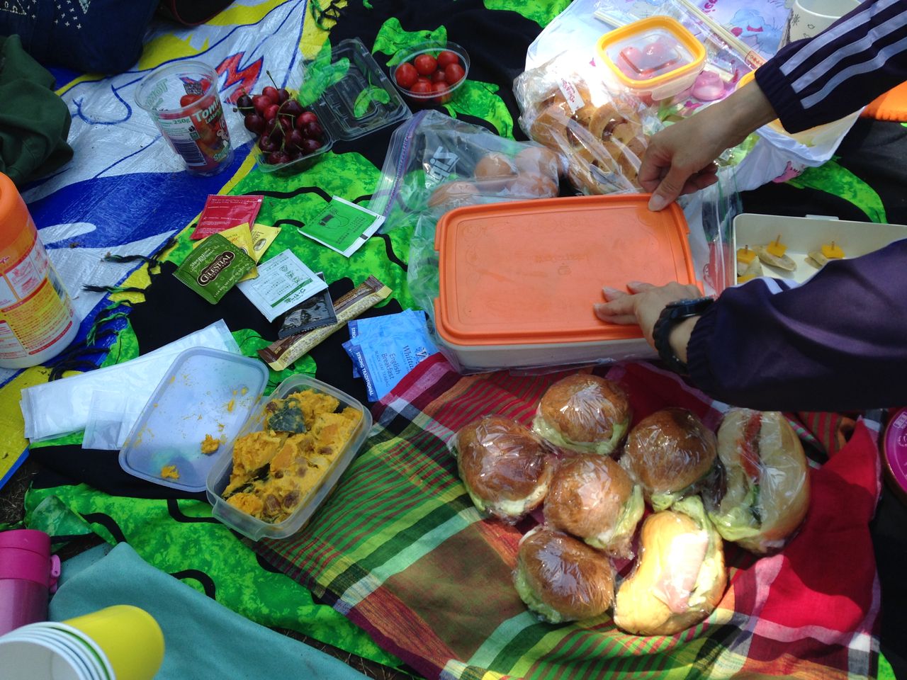 (芝生ですので、レジャーマットの上に、バスタオルをひいたり